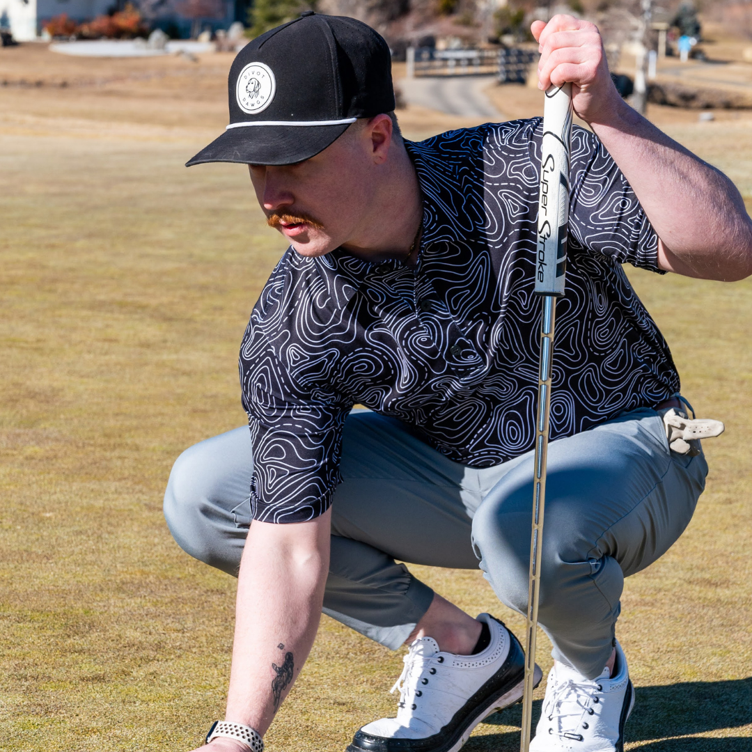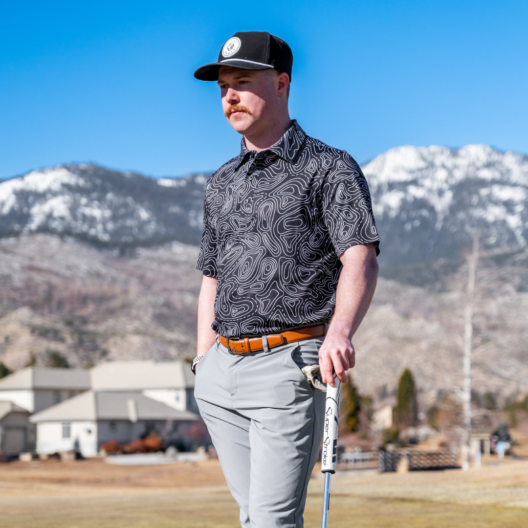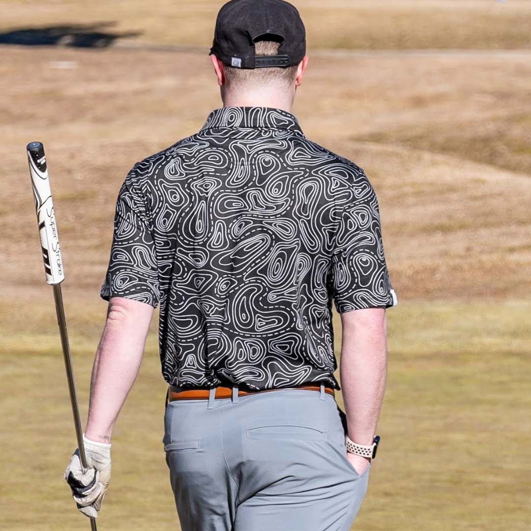 The Shady Slopes Golf Polo is a bold statement piece that blends classic golf style with a modern, minimalist design. Its sleek black base is adorned with a subtle topographic pattern, inspired by the undulating fairways and challenging bunkers of a championship golf course. The soft, breathable fabric ensures optimal comfort, making it perfect for both on and off the course. Whether you’re conquering a tough course or enjoying a post-round drink, this polo is the perfect choice for the discerning golfer.