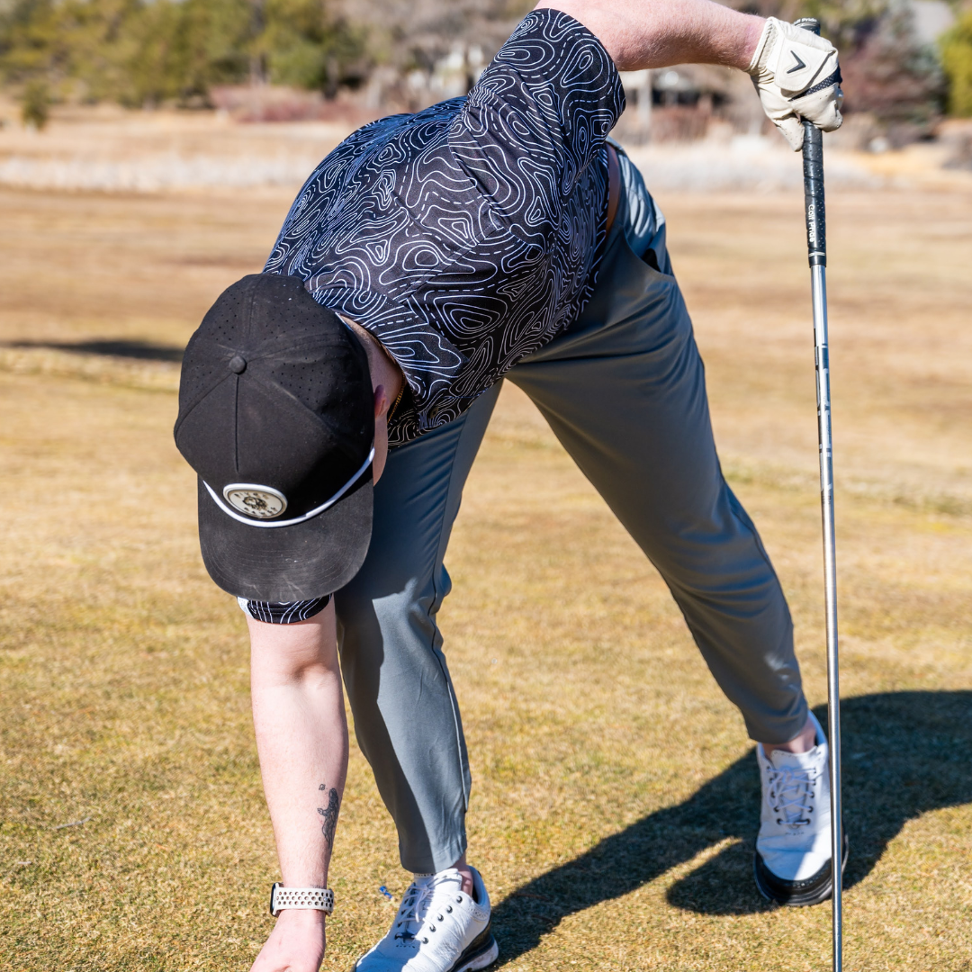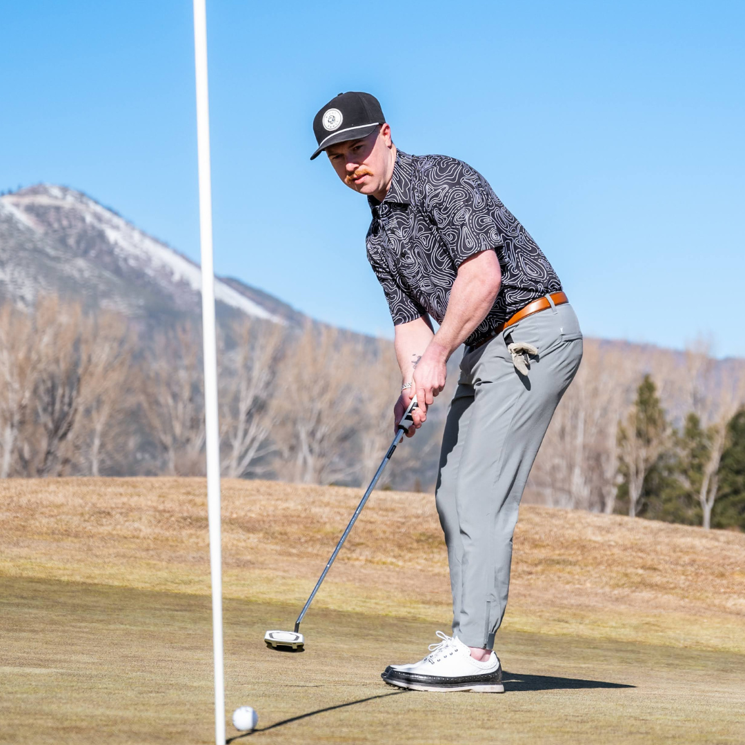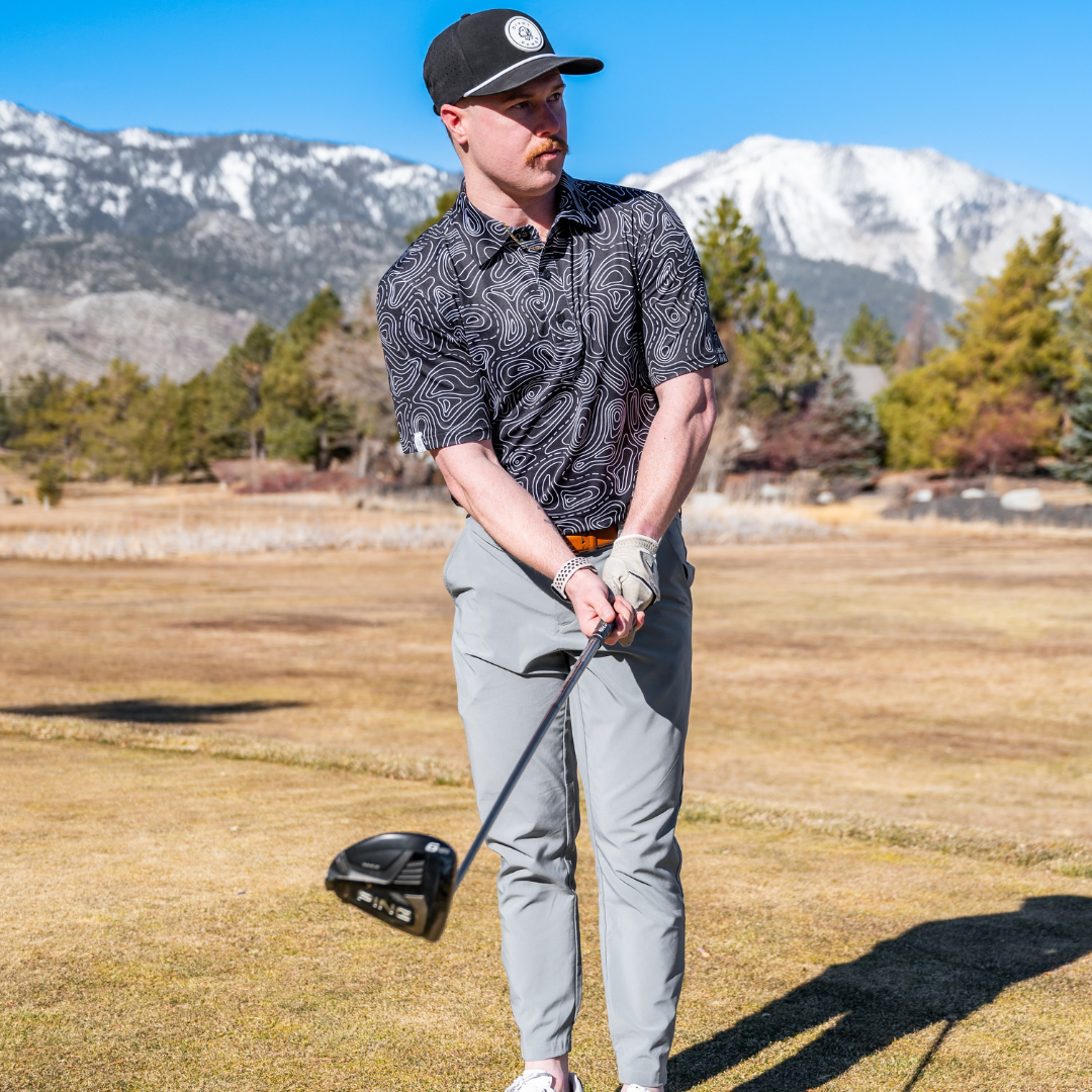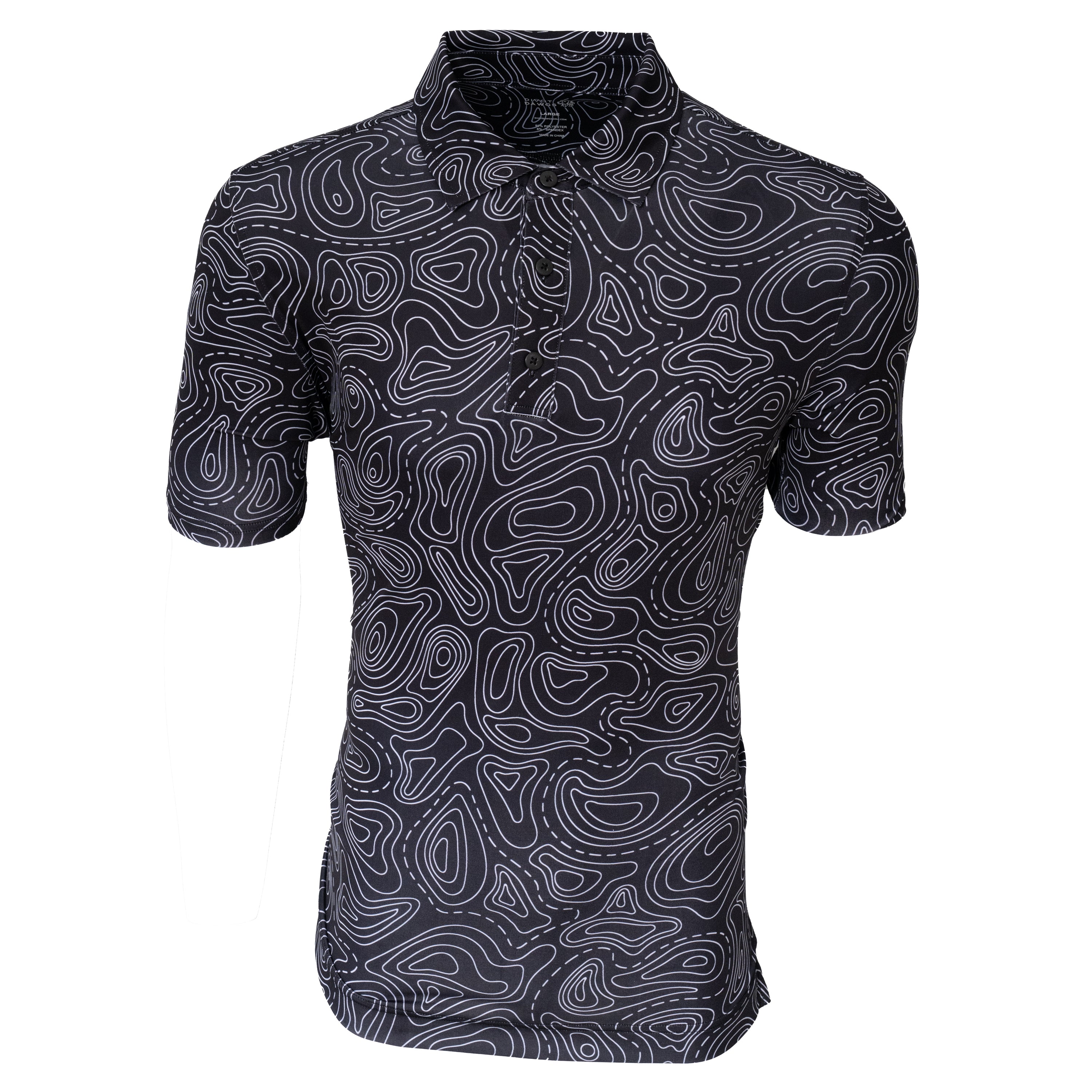 The Shady Slopes Golf Polo is a bold statement piece that blends classic golf style with a modern, minimalist design. Its sleek black base is adorned with a subtle topographic pattern, inspired by the undulating fairways and challenging bunkers of a championship golf course. The soft, breathable fabric ensures optimal comfort, making it perfect for both on and off the course. Whether you’re conquering a tough course or enjoying a post-round drink, this polo is the perfect choice for the discerning golfer.